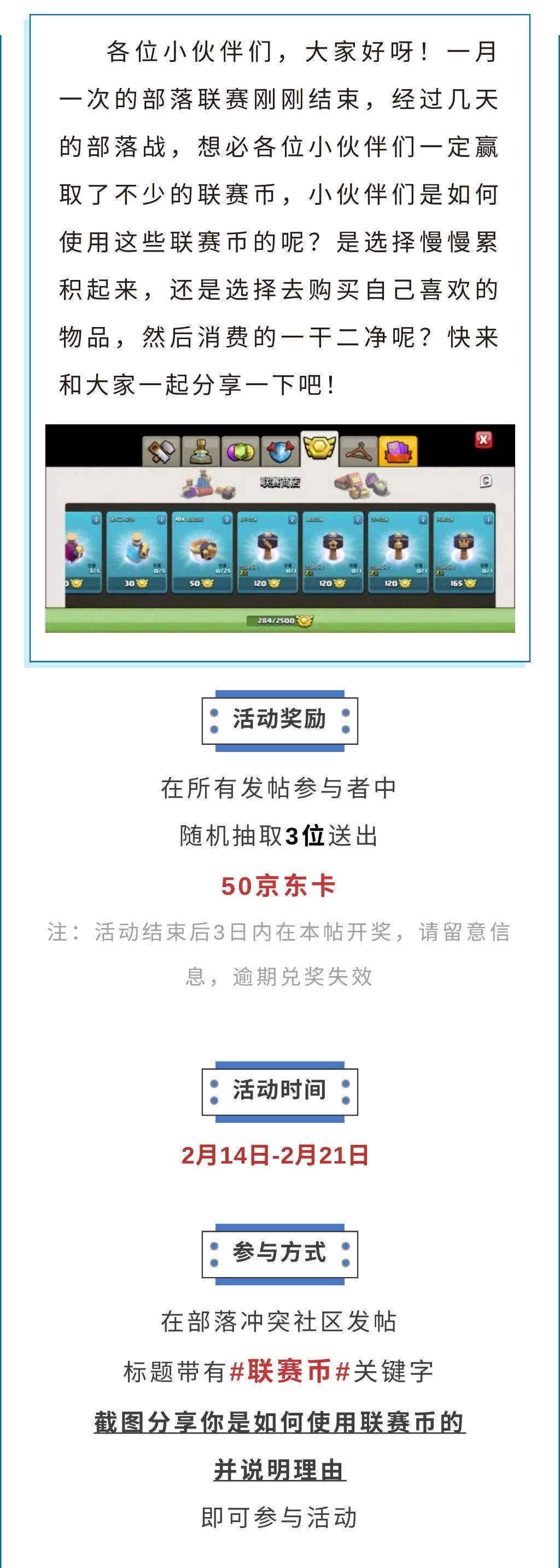 Hi~ 小米游戏中心的小伙伴们大家好啊~ 小管家带着新活动来啦!快点击下方活动链接参与吧~【参与赢京东卡】分享你这个月你在部落捐了多少兵吧!