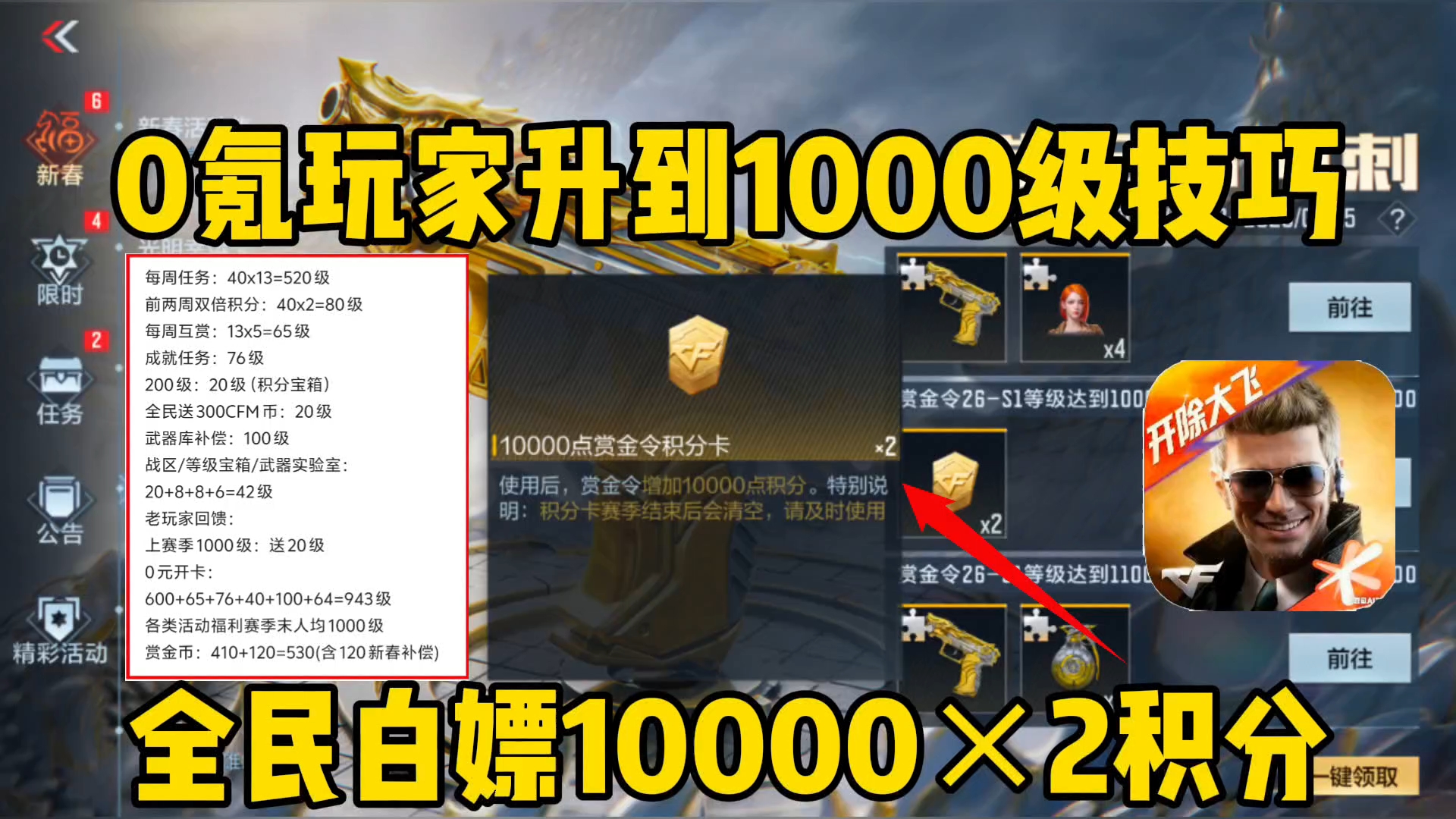 0氪玩家升1000级技巧,全民白嫖10000赏金令积分×2。
