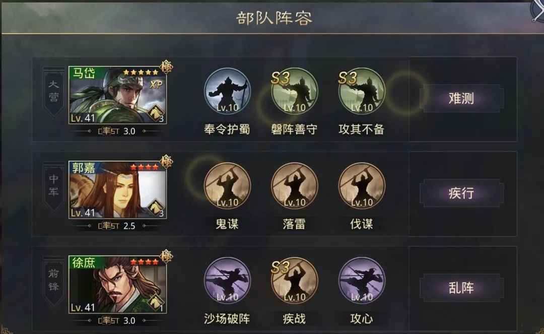 @贾克伟:[前锋]徐庶主战法100%的发动概率,搭配【疾战】最多能给马岱叠上四次被动buff,【利兵谋胜】提供续航还能叠一层buff,理想状态下徐庶一人就能给马岱叠满被动!