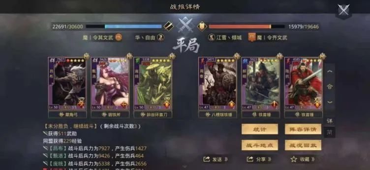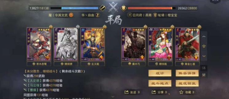 结算的时候一盟【伴我久久】想十三州征服,我们就想进去,给当时的盟主看自己逼格拉满的30级小三皇(现在想起来都想笑),进盟要求30000武勋,于是和朋友一起刷武勋。我拿小三皇,他拿40级汉司马+文钦+曹彰的神奇队伍,就刷了几天,结果他武勋够了,躺进了征服,我就成为了武勋宝宝。