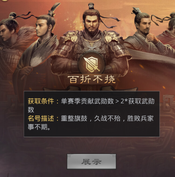 百折不挠名号获取条件:单赛季武勋贡献武勋数>2*获取武勋数。