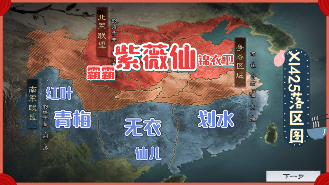 该区3个满编,【南京桃源村】和池塘【摸鱼混】来到了北边,而拱卫京畿的【禁卫军】来到了南边,降落地点和盟名一点也不相同呢。