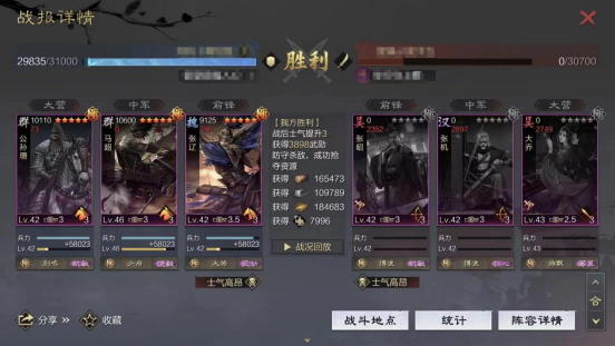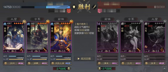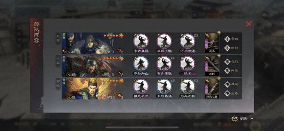 这是当前版本见到的最为强力的行兵队伍,笔者在邀请赛也尝试了这个队伍,效果较为不错,作为五队,完全达到了预期,在面对主城前三队的时候并没有显现颓势,甚至有优势,唯一的槽点就是有些玩家可能没有久战。这个队伍在面对反计和关羽时,可能会比较难受,毕竟是法术主动队,前锋曹操在带天资匕首时,要记得给曹操加20甚至更多的速度,根据环境去改变,为了在曹老板内战时卷属性加成,这是一个比较关键的细节,灵动大将则不用担心这个问题,两种宝物一个为了增加输出爆发,另一个为了防止爆头。