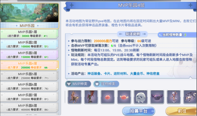 1、MVP乐园共分为10层,需要达到指定的战力和等级要求才可以前往,乐园1层只需要41级战力3万即可参与活动。