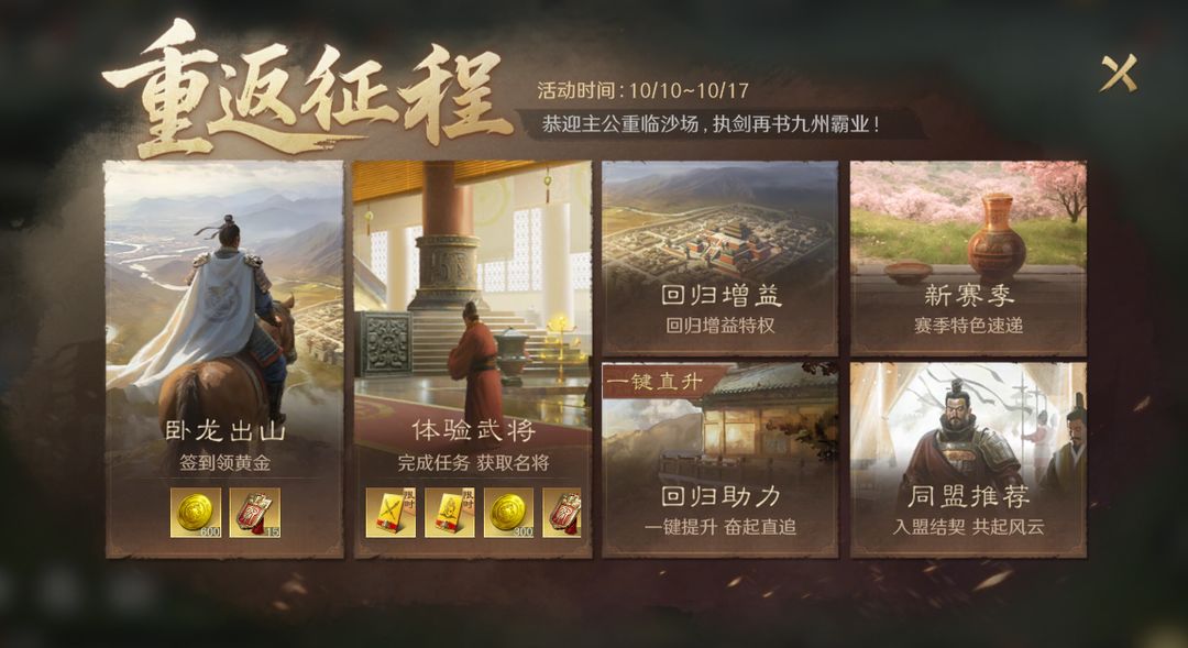 3、「重返征程」获取限时体验武将,活动期间回归主公完成任务即可获得对应奖励,获取限时自选武将卡包、黄金、求贤令。