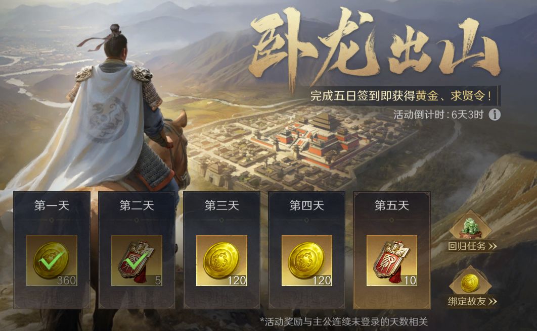 2、「卧龙出山」回归专属加油补给包,活动期间回归主公每日登录即可获得奖励,奖励将于每日0点解锁,每日登录奖励仅可领取一次。