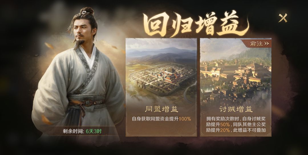 4、「回归增益」助力主公同盟发展,活动期间回归主公加入同盟即可获得对应增益,获取限时自选武将卡包、黄金、求贤令。