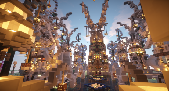 这些城堡的体型非常独特,十分纤细。但是却不影响它们的华丽度。最中间的那一座是由下方螺旋状的水撑起了的,这样的设计以及非常的魔法了。
