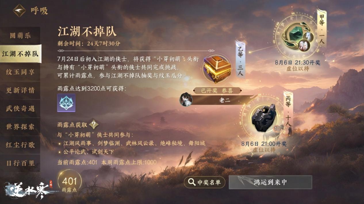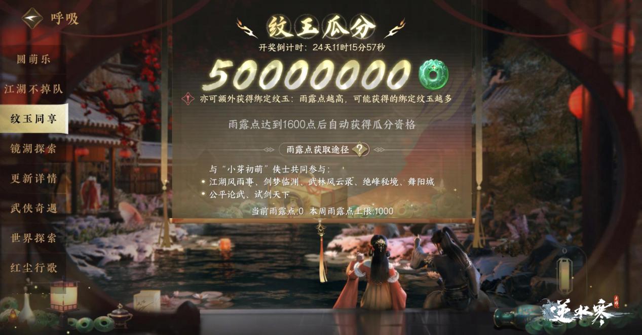 积累雨露点,不仅可报名参与每周抽奖,奖品包括天赏石、稀有内功与天外陨铁。达到一定数量,还可瓜分50000000(小寒数了三遍没数错,就是7个0,五千万)纹玉与超多绑玉。