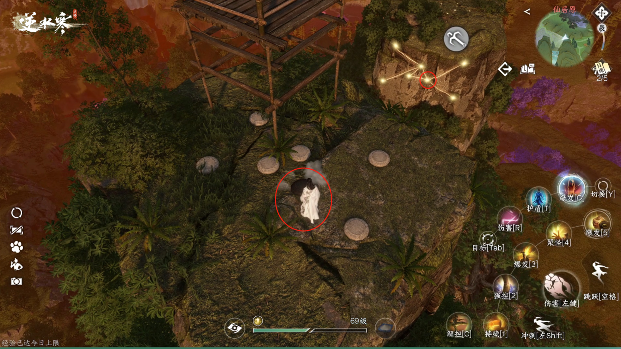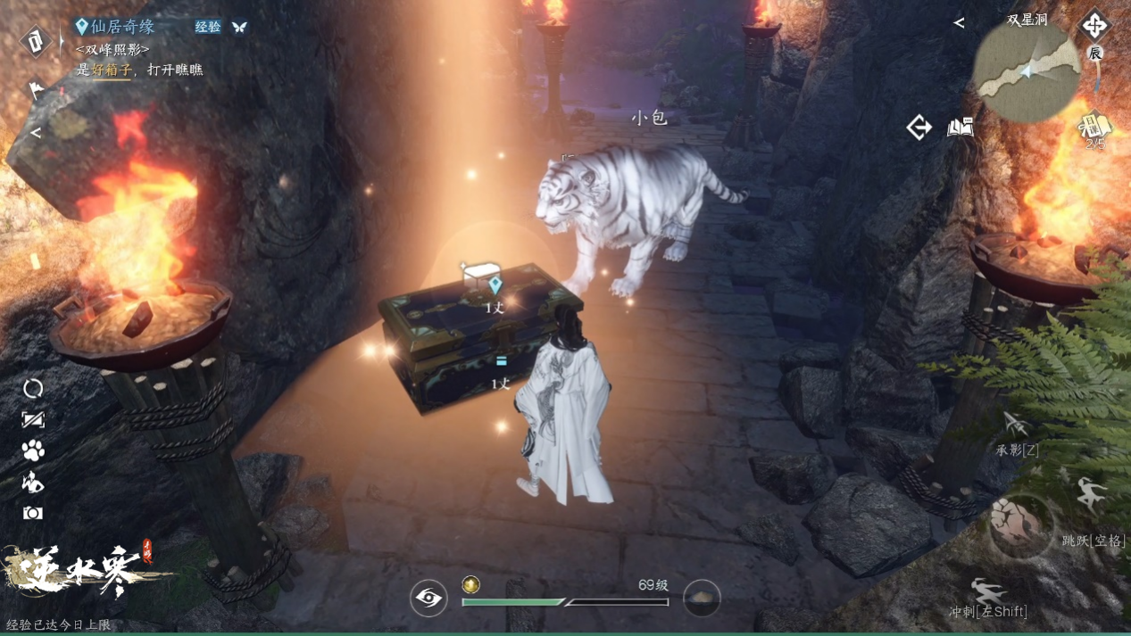 2、 跟随任务指引来到双峰山底的洞门,发现洞门打不开,需要前往山顶解谜。此时使用钩绳可以快速来到山顶。当然,施展轻功飞上来也可以。