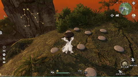 3、 重点来了:观察对面山峰的“星文”,然后举起黑色棋子,将棋子放在如下图位置,拼成与对面山峰所示星文同样形状,即可解开本山峰谜题。