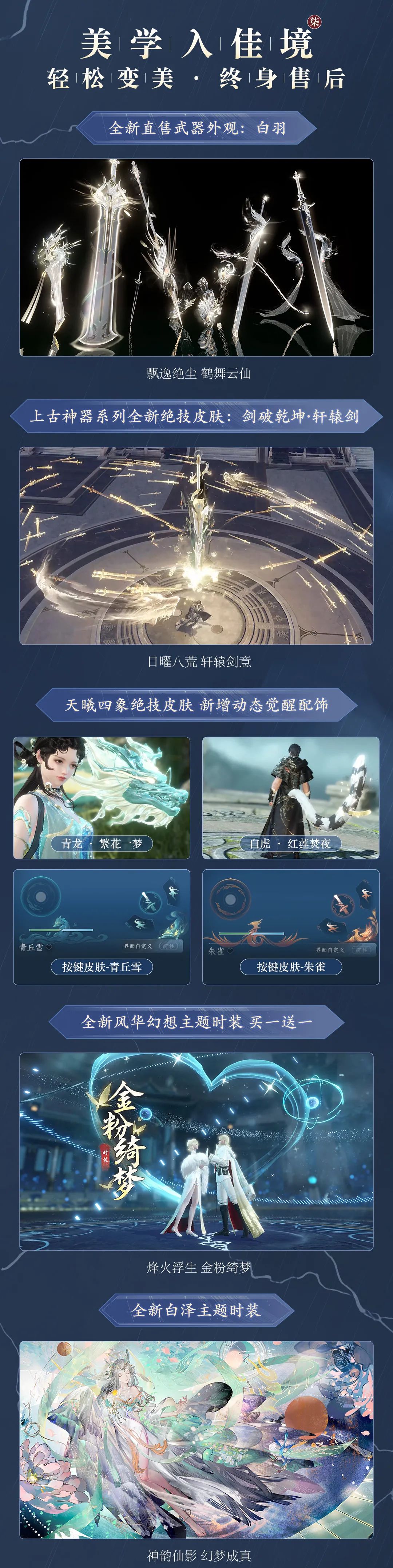 既有以免费和低价为主流的海量精美外观上新,包括全新直售的武器外观,让您轻松变美;也有奢华的时装和祥瑞彰显您的尊贵和与众不同……