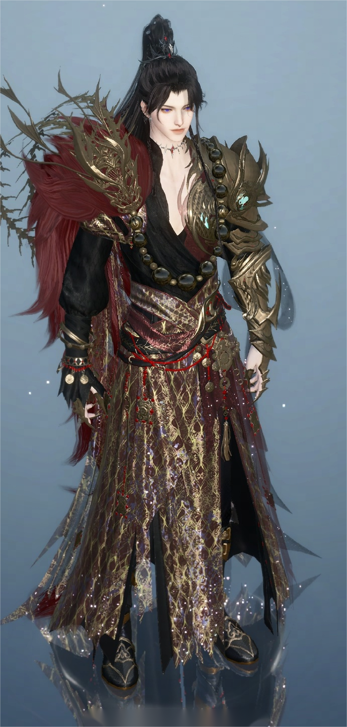 少年不羁,身着一袭黑金华服,尽显贵族气质;披着红色毛领,彰显出他独有的个性与热血激情。