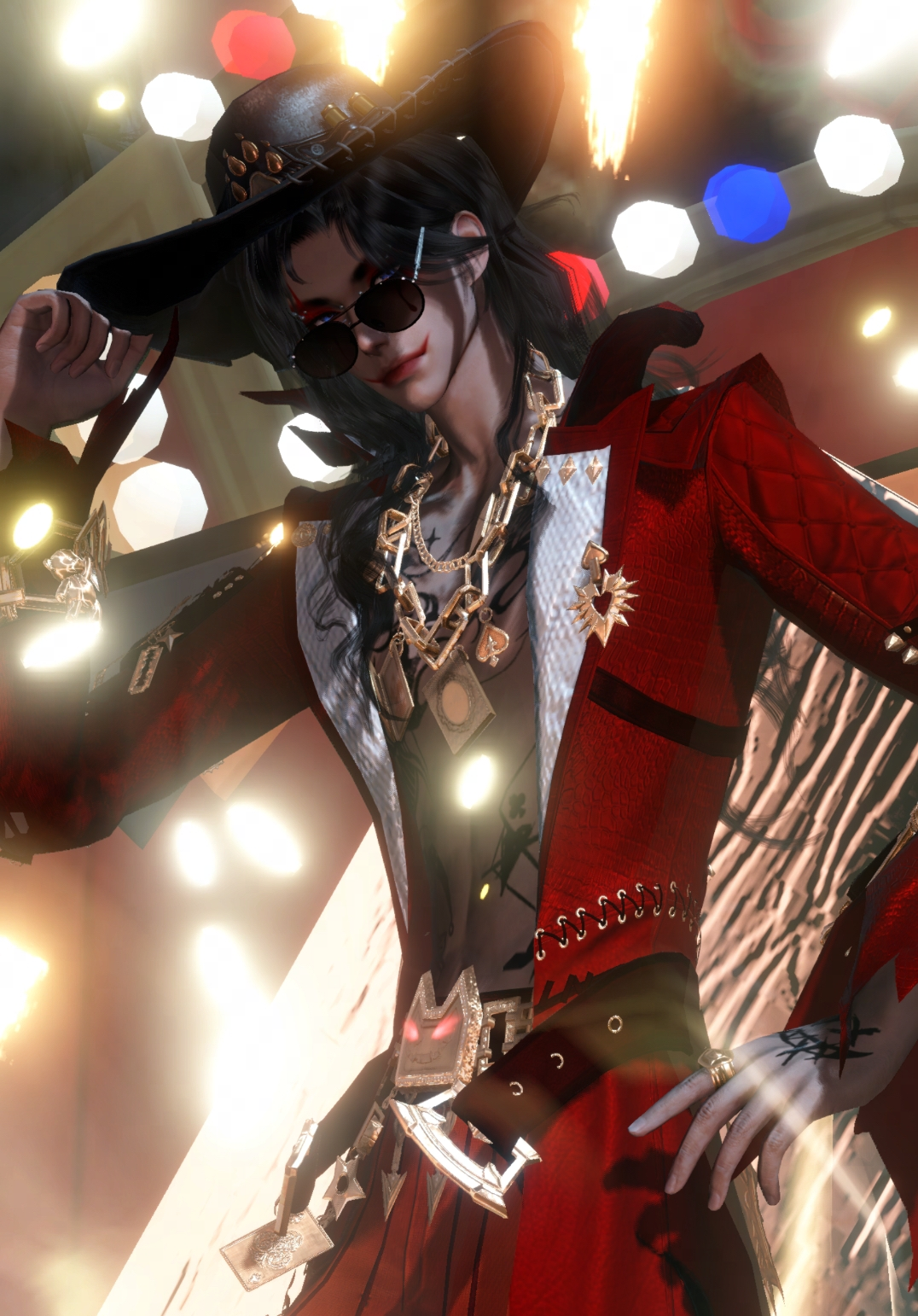 一身黑色长款西装搭配一顶黑帽,可谓霸气十足!