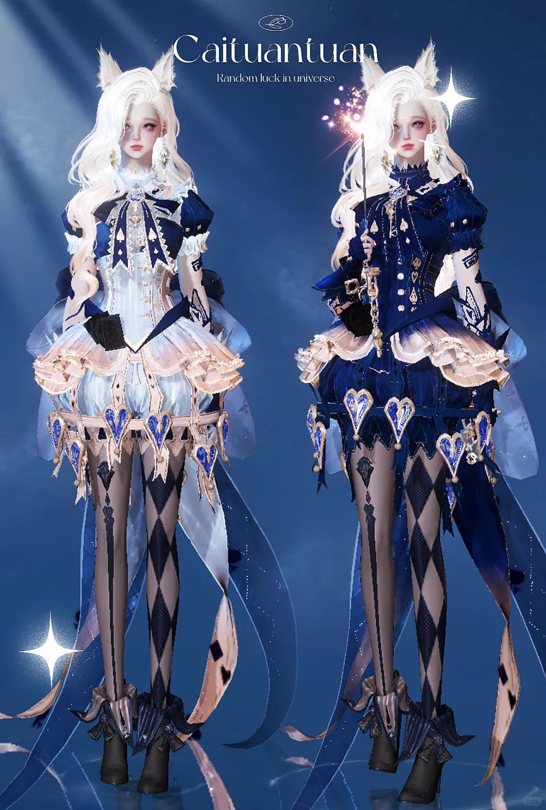 黑与蓝的碰撞,宛如夜色中飞舞的蓝闪蝶,神秘又迷人;而经典的黑与白与副本掉落发型【星落月皓】的搭配,则更是和谐美丽。