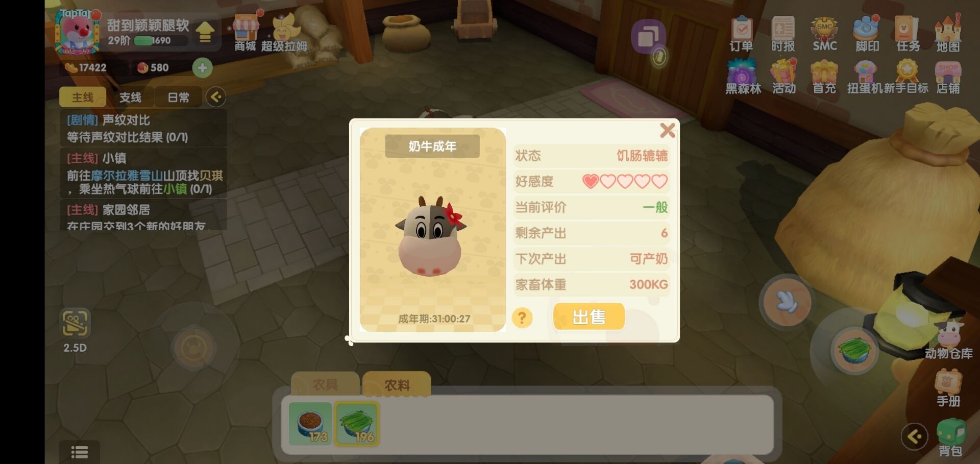 它们会自动消耗饲料,慢慢等它们长大,只有成年的奶牛才能产奶。你抓一下,会显示时间的,成年了还要继续等她生产,除非显示没有奶了,才可以售卖150摩尔豆。