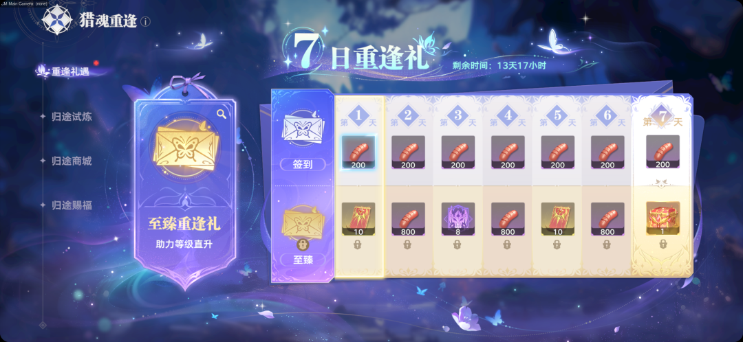 重逢礼遇:免费7天签到得200体力/日;25元直购解锁至臻签到,更享服务器等级同步直升,自动跳过剧情与称号任务,追赶大部队。