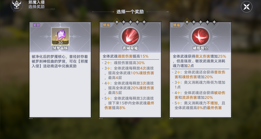 ●邪魇清剿:每个轮次开启时,邪魇将随机入侵魂师已探索过的大陆,10个邪魇将分布大陆的不同位置等待魂师前往清剿,每次挑战不消耗体力和道具,轮次期间可自由尝试,在清剿中被击败时可消耗道具复活2次;清剿成功后可从少量【异梦晶核】和2个【神遗赐福】中选择1个进行获取。
