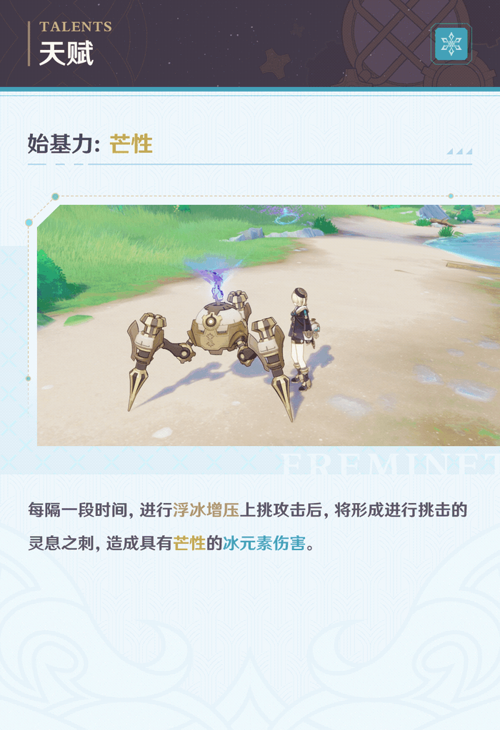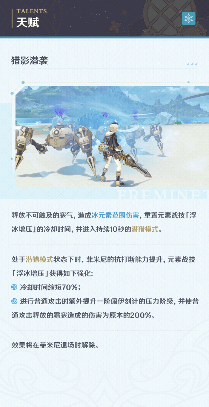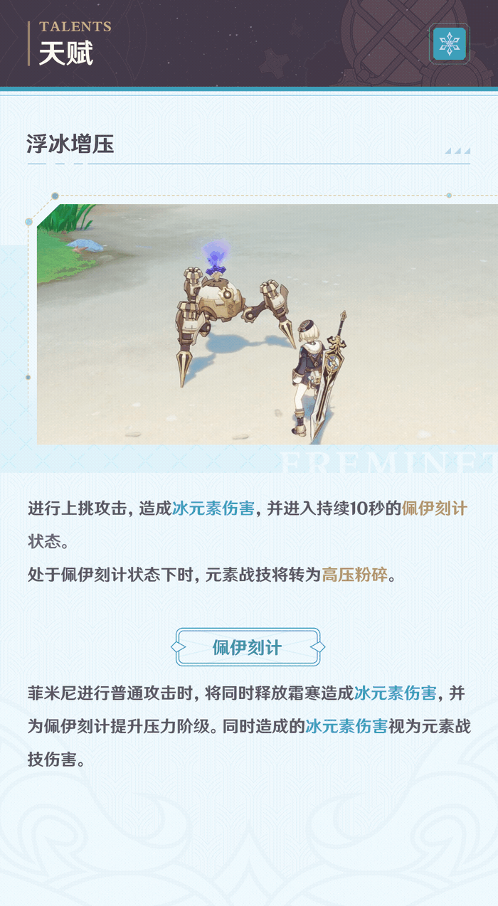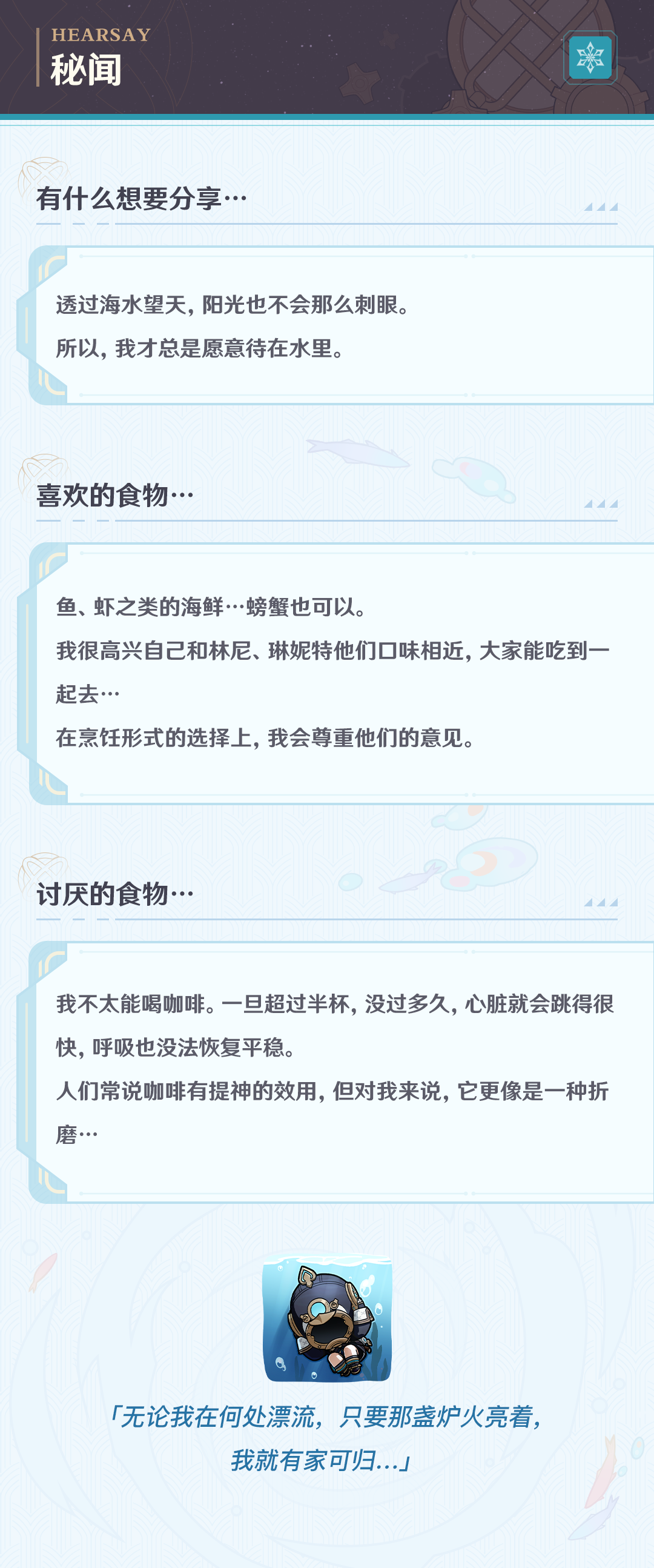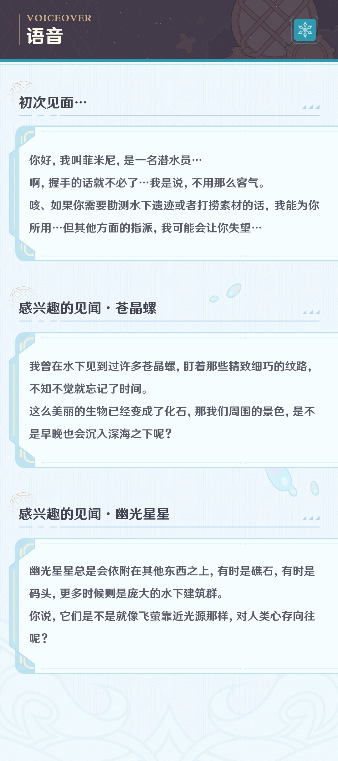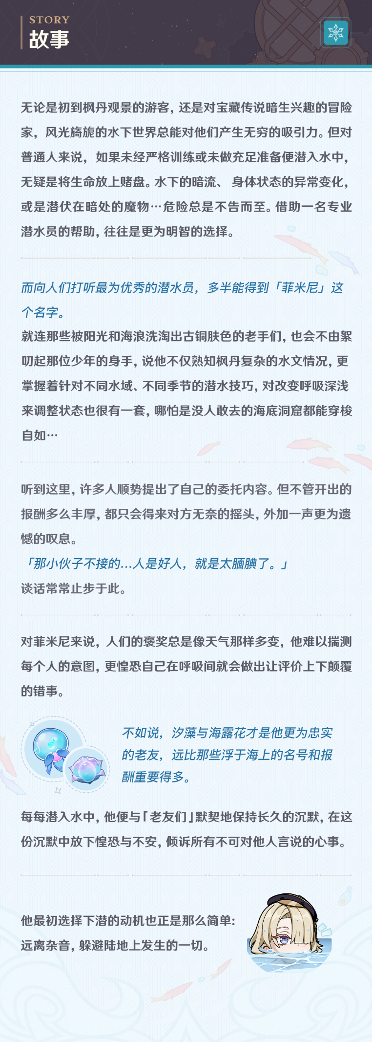 旅行者们好呀!今天为大家介绍的角色是菲米尼,这位精于潜水的寡言少年,在如寒冰般拒人千里的外表下,藏有一颗无瑕的纯真之心,一起来了解他吧!