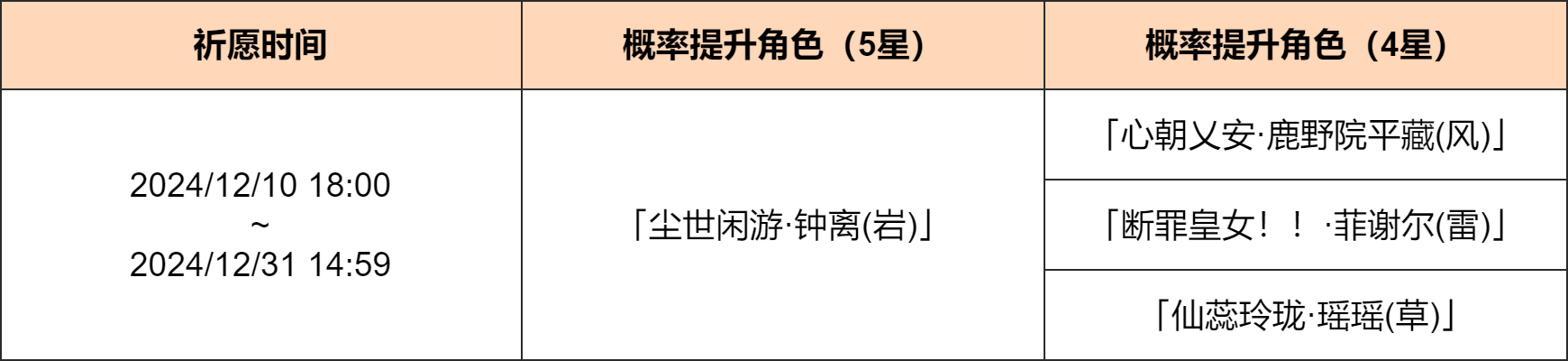 ●活动期间,4星角色「心朝乂安·鹿野院平藏(风)」「断罪皇女!!·菲谢尔(雷)」「仙蕊玲珑·瑶瑶(草)」的祈愿获取概率将大幅提升!