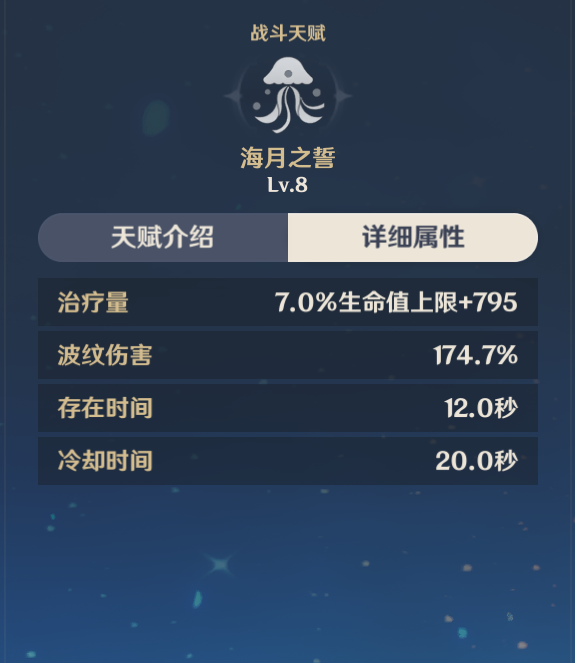 存在12秒,7次伤害及挂水,除去第一下应是每两秒挂一次水,冷却20秒,全部打到敌人身上产生3~4个水元素微粒。无大招时主要治疗手段。相对于
