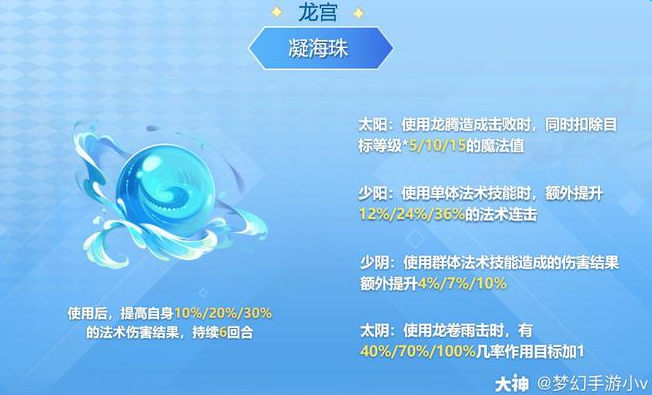 法宝效果:使用后,提高自身10%/20%/30%的法术伤害结果,持续6回合。