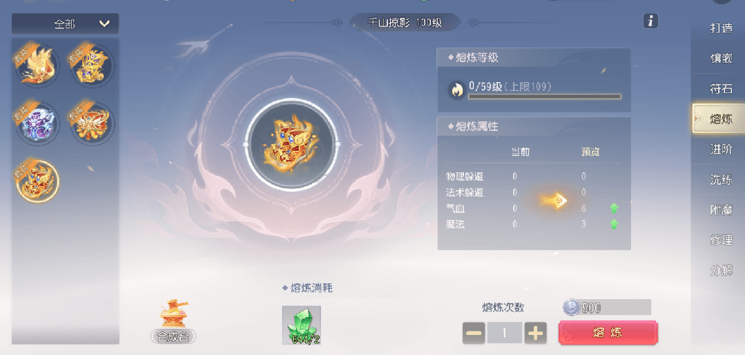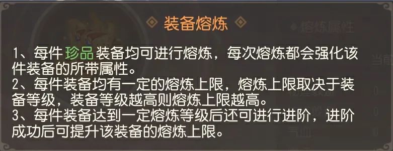 每次熔炼均会提高该装备的所有白字属性,且每次熔炼必定成功。当所有装备熔炼至50级后均可进行进阶,进阶后装备的品阶将由紫色上升为橙色,且会同步提高该装备的大量白字属性。