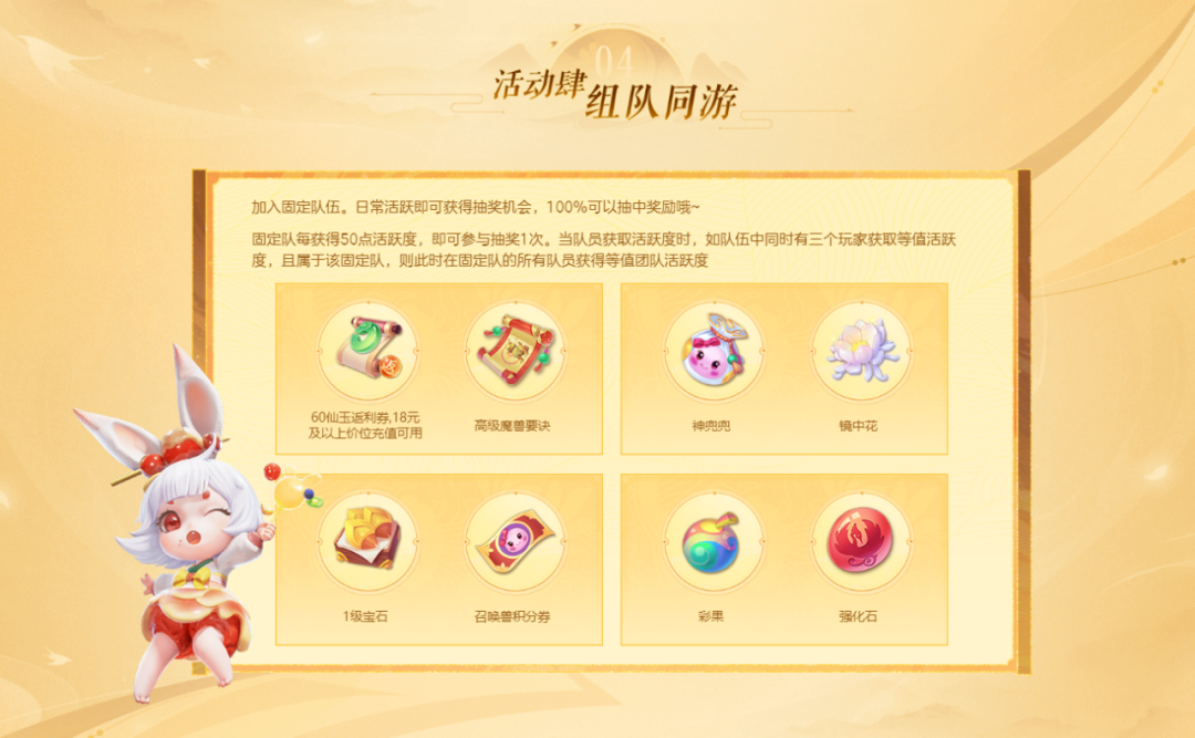 团队已有成员邀请其他成员时,邀请人和被邀请人均可获得1次抽奖机会,首次分享抽奖结果可额外获得1次抽奖机会,参与抽奖即有机会获得【神兽*1(随机)】、【虎头怪抱枕*1】、【五宝*1(随机)】、【神兜兜*1】和大量【银币】!