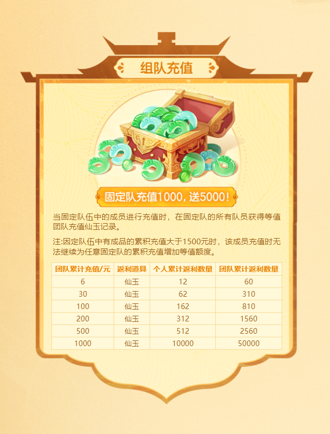 在活动期间固定队充值还能享超高返利!固定队成员进行充值时,队内所有少侠将获得等值团队充值仙玉记录。若有团队有少侠累积充值已大于1500时,该少侠再充值将不会继续为任意团队累积团队充值。