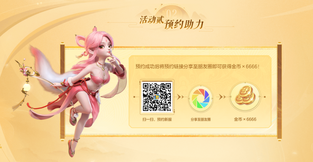 本次新服活动新增福利【预约助力】,诸位预约成功后将界面分享至朋友圈,还能额外获得6666金币奖励!