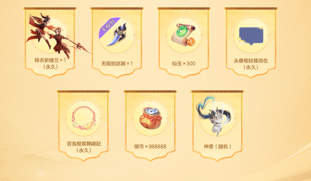 诸位在活动页面登录账号预约新服,百分百可得新服专属礼包,预约奖励将会发放到绑定角色的游戏内邮箱,可在开服后进入游戏查收。礼包内含:锦衣【斩楼兰】*1、无级别武器*1、轻蝶自在头像框*1、500仙玉充值返利券*1、蝶舞翩跹冒泡框*1和大量银币。