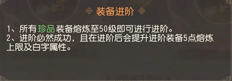 当拥有的所有珍品装备熔炼等级提升至50级时,少侠可以选择对该装备进行进阶,进阶成功率100%,且可把该装备进阶为紫色装备。