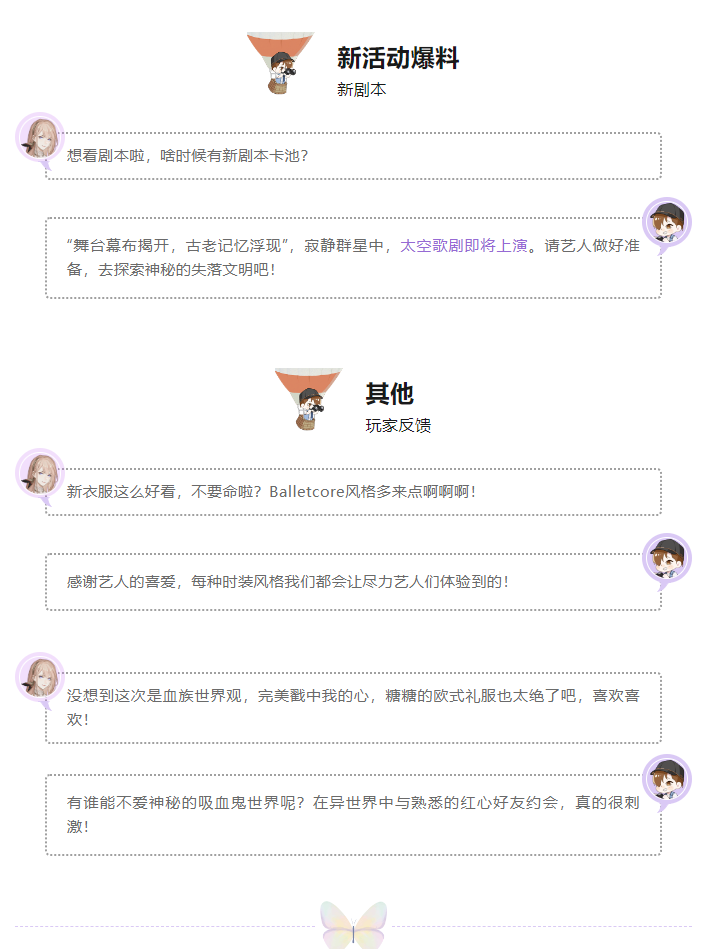 七夕约会即将上线,艺人们做好准备和红心好友去异世界冒险了吗?除了新约会,娱记我还打听到一个消息,全新题材剧本找到了各位艺人,很快大家又要挑战全新的电影啦!话不多说,我火速和策划姐姐一起安排了新的茶话会,为大家答疑解惑!