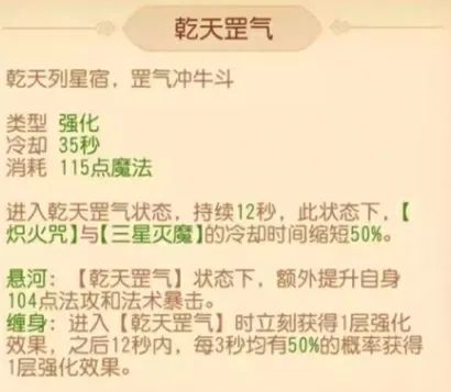 【乾天罡气】为强化技能,提供高额攻击,暴击和获得强化效果。附带减少【炽火咒】、【三星灭魔】的缩短50%冷却时间。