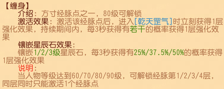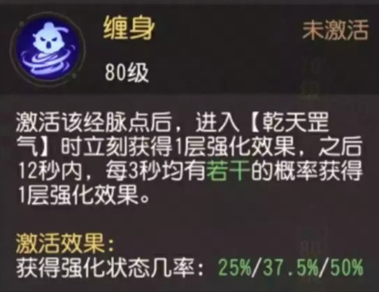 80级经脉推荐选择【缠身】。激活效果为:进入【乾天罡气】时立刻获得1层强化效果,持续期间内,每3秒获得有若干的概率获得1层强化效果。继续增加获得强化几率,保持强化不断及持续的高强度输出。