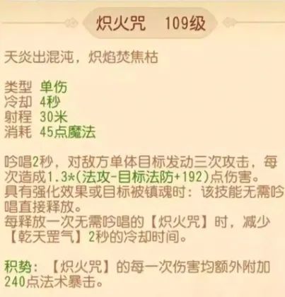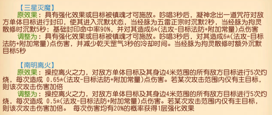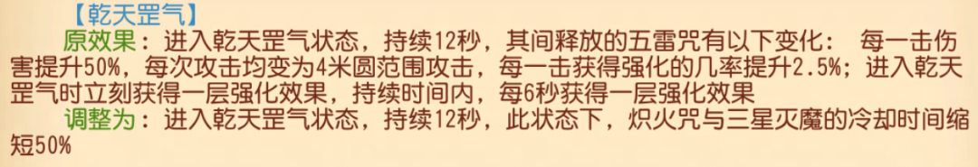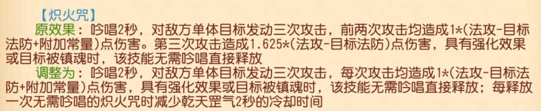 技能【炽火咒】每次攻击造成的伤害调整为:1*(法攻-目标法防+附加常量)点;同时,每释放一次无需吟唱的【炽火咒】时减少【乾天罡气】2秒的冷却时间。