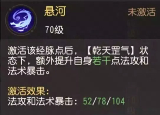 70级经脉推荐选择【悬河】。激活效果为:【乾天罡气】状态下,额外提升自身若干点法攻和法术暴击。继续加强【乾天罡气】状态。