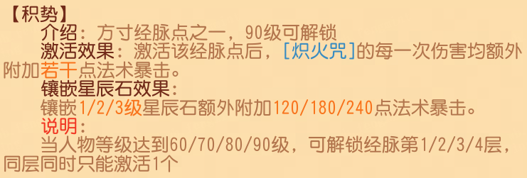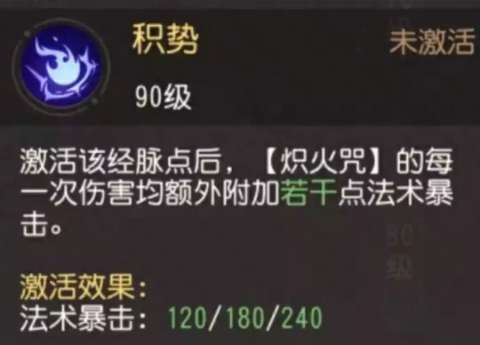 90级经脉推荐选择【积势】,激活效果为:激活该经脉点后,【炽火咒】的每一次伤害均额外附加若干点法术暴击。