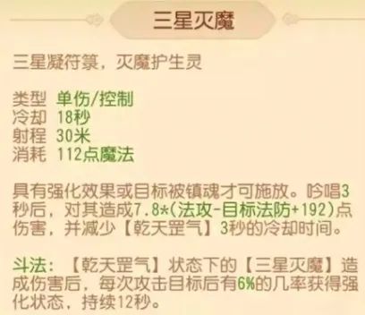 技能【三星灭魔】移除输出经脉下的沉默效果;释放后降低【乾天罡气】3秒的冷却时间。