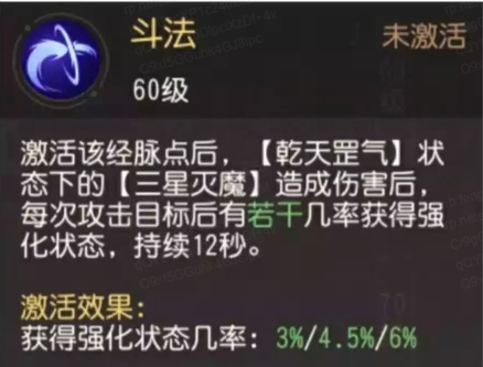 首先,推荐经脉加点如下:60级选择【斗法】。激活效果为:乾天罡气状态下的【三星灭魔】造成伤害后,每次攻击目标后有若千几率获得强化状态,持续12秒。