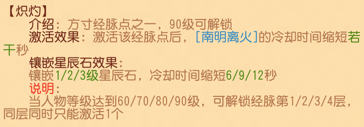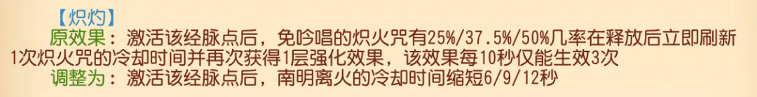 经脉调整中主要影响较大的为【炽灼】,移除了刷新【炽火咒】冷却时间的效果,改成了缩短南明离火的冷却时间6/9/12秒。其他调整不作赘述。