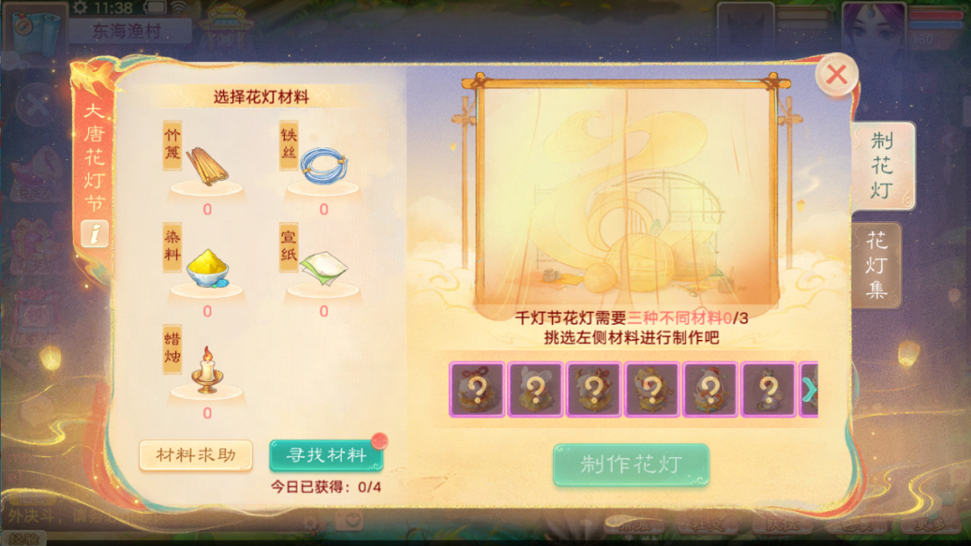 长安城正在热火朝天的准备千灯节,却出现了一些捣蛋分子!少侠快去驱逐他们,获取不同的花灯材料并制作花灯与花车吧!