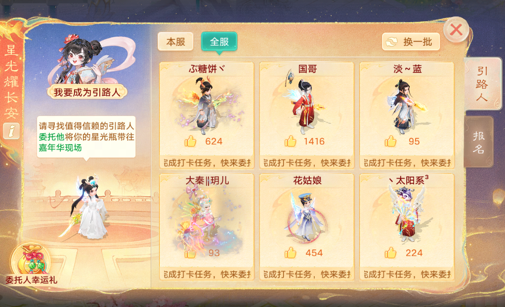 嘉年华期间,全体少侠将分为“星光引路人”、“星光委托人”两种身份;拥有门票的少侠可主动申请成为“星光引路人”,可携带委托人的星光前往嘉年华现场完成线下打卡,委托人越多,收获的奖励则越丰富,有机会赢取高级藏宝图、永久限定称谓等好礼。同时完成《星光耀长安》打卡任务,引路人自己和他的全部委托人都将享受游戏内永久背饰—星安的获取门槛将超大幅度降低、提前开启星光抽奖两重游戏特权!未拥有门票的少侠则成为“星光委托人”,委托人可将自己的星光委托给引路人前往线下嘉年华,完成《星光耀长安》打卡任务,如果自己委托的引路人在线下嘉年华抽中神兽、珍稀神兽大奖,自己也能获得幸运礼盒,有几率获得神兽哦!
