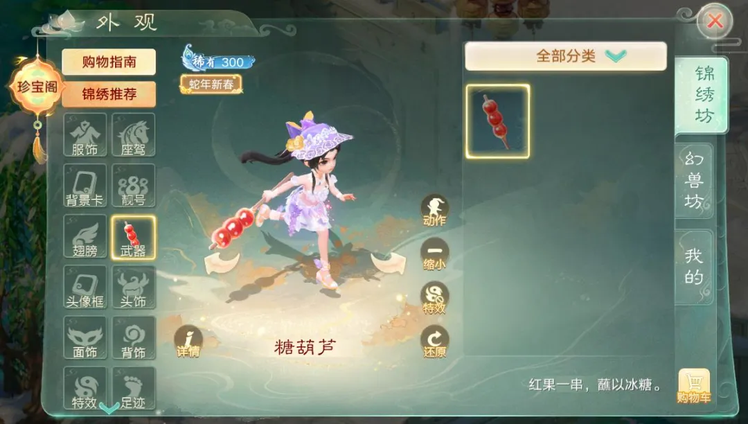 新外观品类“武器幻肤”开启抢先体验!符合抢先体验资格的少侠将在本周维护后收到邮件,领取武器幻肤道具[糖葫芦(1天)]。