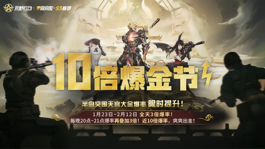 1月23日-2月12日,半岛突围天宫大金全天3倍爆率,每晚20点-21点,爆率再叠加3倍,接近10倍的爆率,让你满载而归!