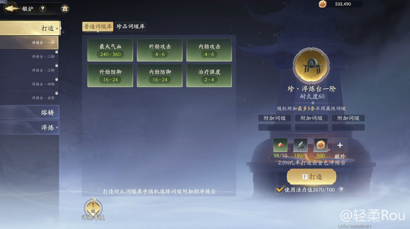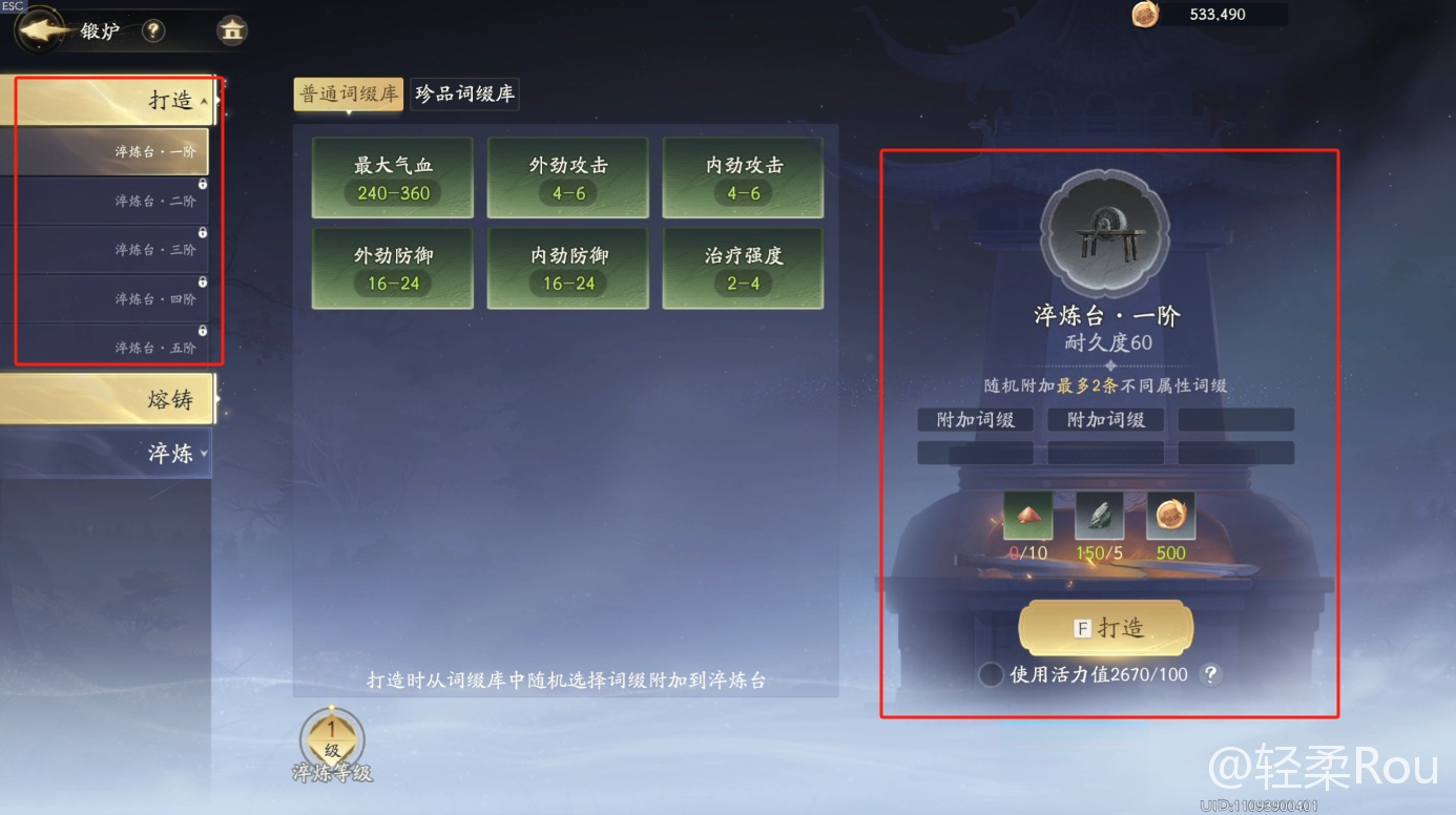 打造出自己想要的词缀淬炼台以后,我们同界面切换到淬炼,开始对我们身上的武器进行淬炼强化