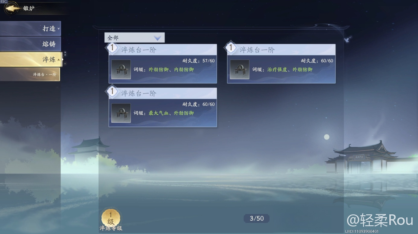 通过消耗一定材料,打造淬炼台,其中第一个材料装备粉尘可以在这个界面的熔铸那里分解装备获得。