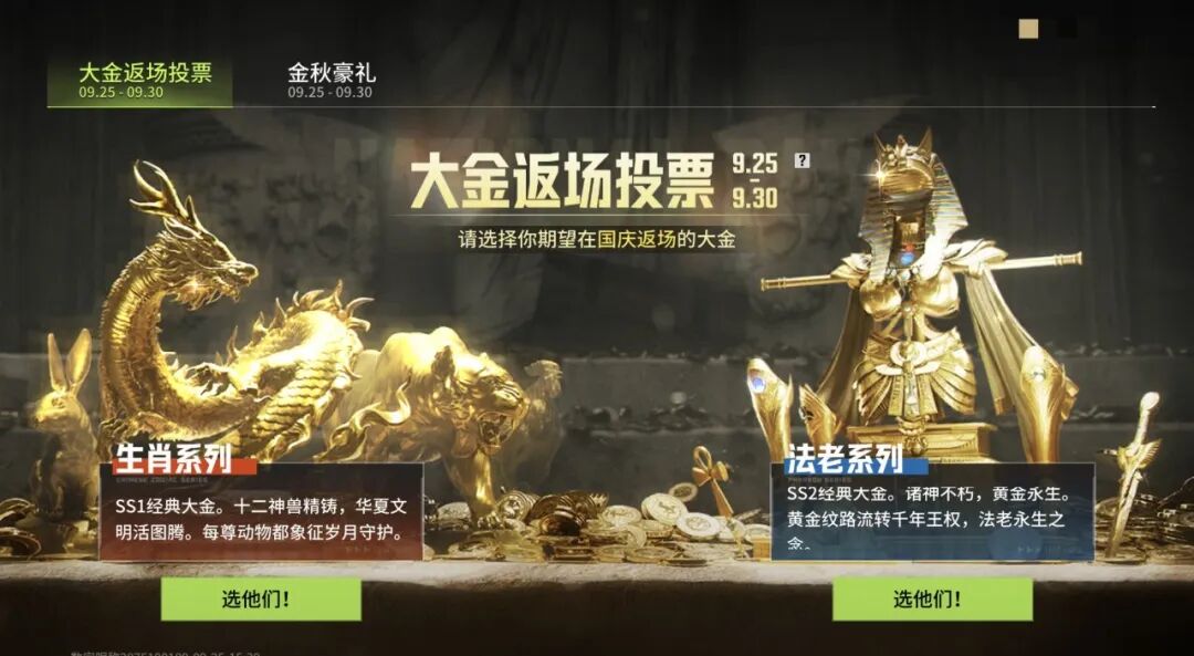 大家的呼声我们听到了!前往游戏内进行投票,十二生肖大金与法老大金进行返场PK!究竟谁能惊喜返场?这个决定权,交到萤火虫们手里!