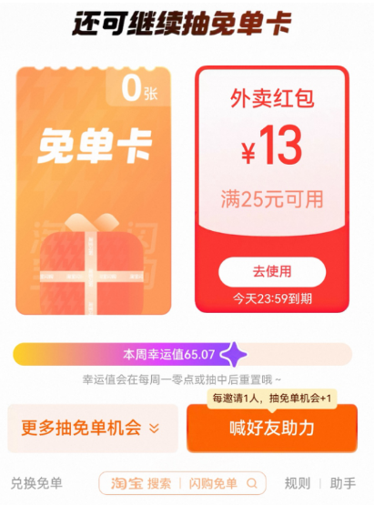 除大额优惠券福利,更有幸运值叠加 —— 积累淘宝闪购幸运值,攒满100幸运值,直接抽中当日免单卡一张~