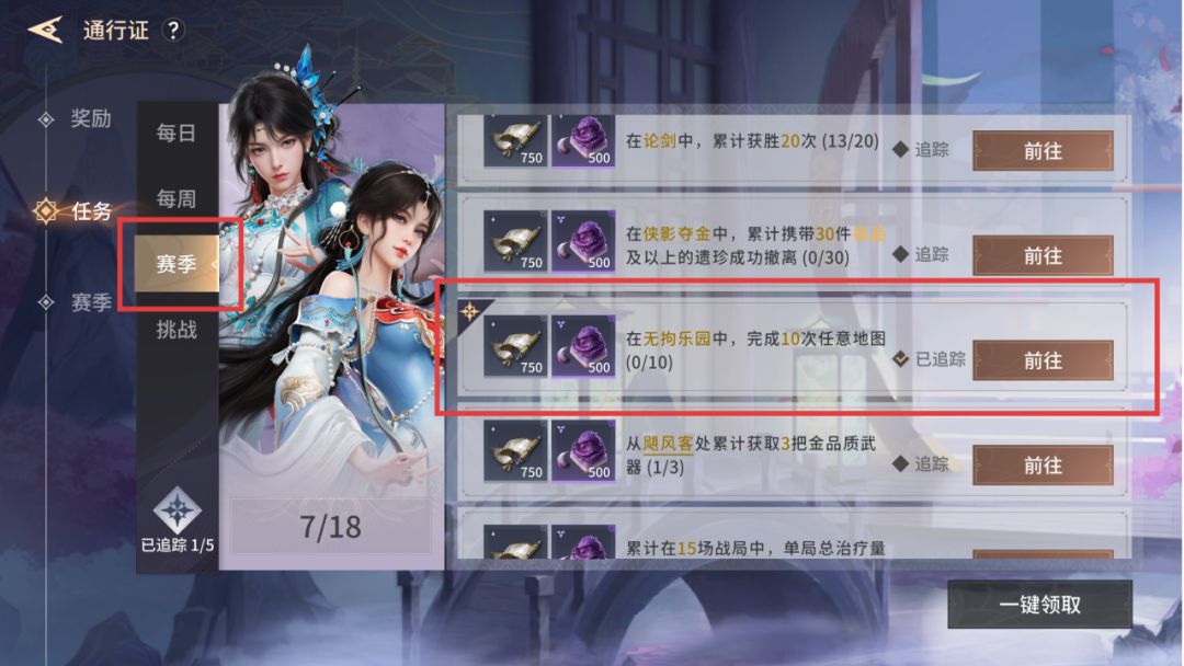 大家打开通行证可以看到,通行证的每周任务和赛季任务中已加入了无拘乐园相关任务。